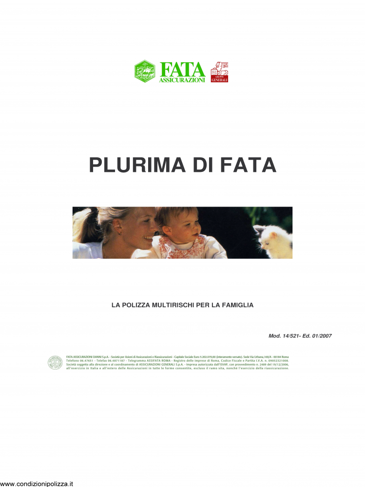 Fata – Plurima Di Fata – Modello 14-521 Edizione 01-2007 [38P] Compagnia : Fata Prodotto : Plurima Di Fata Descrizione : La Polizza Multirischi Per La Famiglia Modello : 14-521 Edizione : 01-2007 Formato Documento : PDF N. Pagine Documento : 38 €2.50 – Acquisto Checkout Aggiunto al carrello